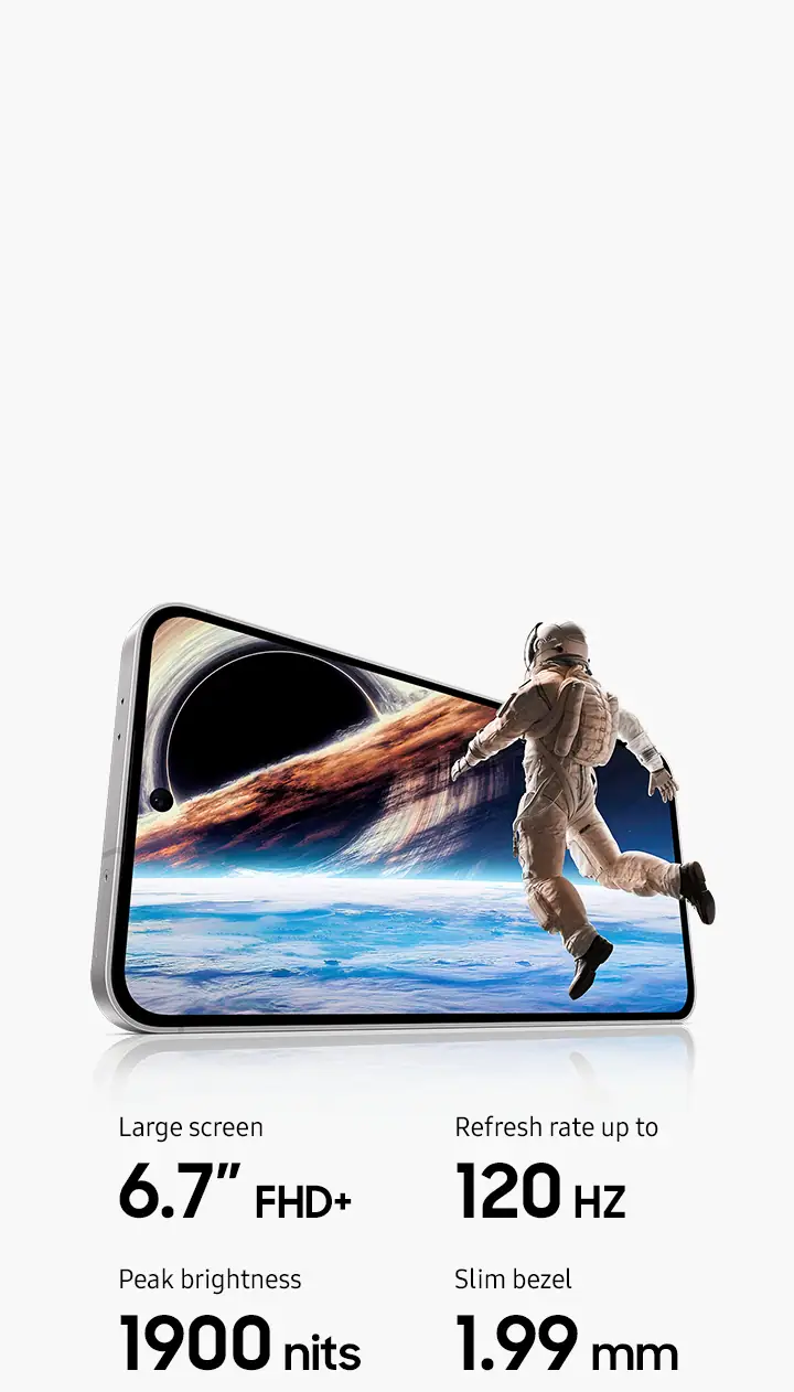 صفحهنمایش 6.7 اینچی Galaxy S24 FE با فناوری Dynamic AMOLED 2X و نرخ نوسازی 120 هرتز، تجربهای روان و لذتبخش در تماشای محتوا و بازیها فراهم میکند. این صفحهنمایش با پشتیبانی از HDR10+ و Vision Booster، رنگها را با وضوح بالا و روشنایی مناسب نمایش میدهد.